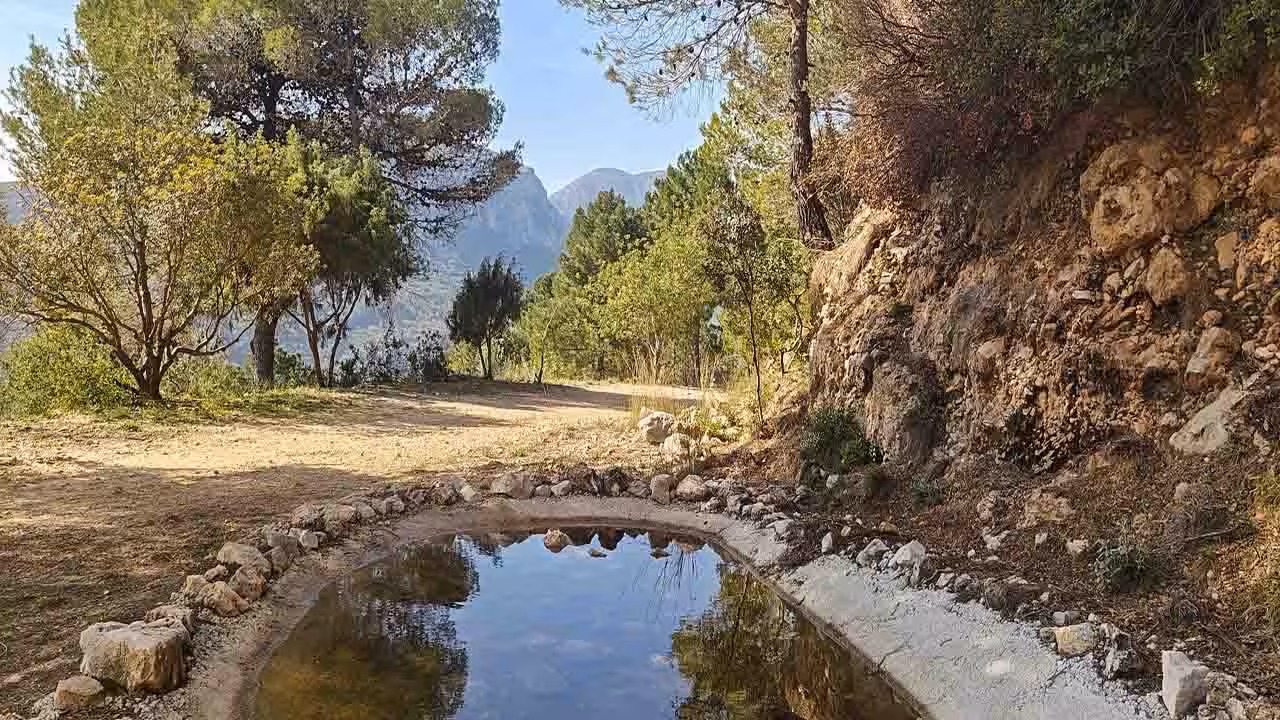 Seguimos caminando hasta llegar a uno de los estanques “Les Basses de la Drova”. Son unas balsas de agua construidas en el siglo XVIII por los monjes del monasterio de la Valldigna para facilitar el riego en el Pla de la Drova. El camino es muy agradable, siempre viendo el Mondúver y disfrutando de las vistas.