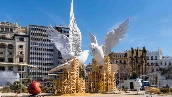 Desde Convento, 5 minutos andando te separan de la Plaza del Ayuntamiento. Con un Charlot de 20 metros como figura central, esta falla no compite en Sección Especial, pero es la más fotografiada y el epicentro neurálgico de las Fallas. Un homenaje a Charles Chaplin con mensaje pacifista que merece la parada obligatoria.